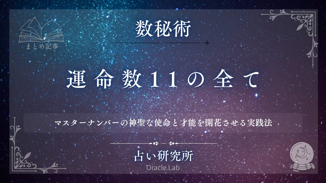 運命数11は数秘術における最も強力なマスターナンバーの一つです。このガイドでは、11という特別な数字が持つ深い意味から、性格特性、恋愛傾向、相性、才能の活かし方、そして2025年の運勢まで、運命数11のすべてを網羅的に解説します。強力な直感力と感受性を持つあなたが、その神聖な使命を現実世界で開花させ、スピリチュアル・リーダーとして現代社会を導くための具体的な実践法をお伝えします。単なる性格診断を超えて、魂レベルでの成長と使命の達成を目指す方に向けた、実践的かつ包括的な完全ガイドです。