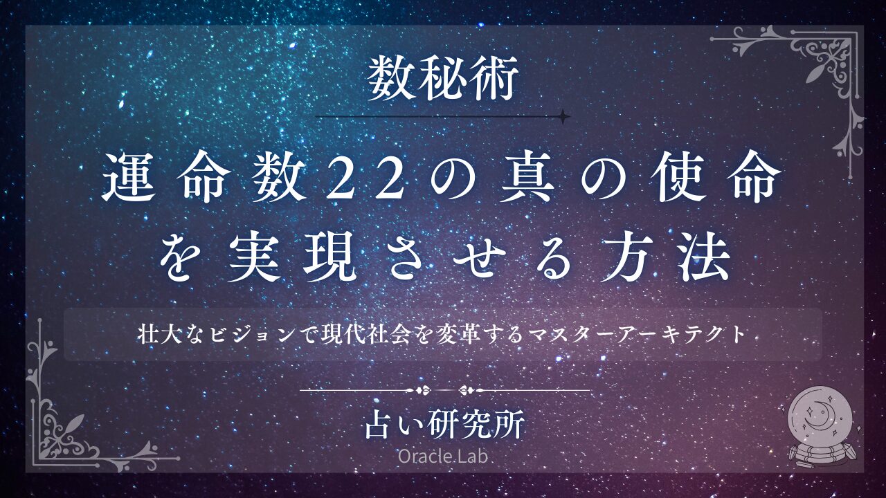 運命数22について徹底解析。「壮大すぎるビジョンで理解されない」「責任が重すぎてプレッシャーに押し潰される」「完璧主義で行動に移せない」「理想と現実の両立で疲弊する」「期待が大きすぎて失敗を恐れる」「組織を動かす力が重荷になる」といった運命数22特有の悩みの原因と解決策を詳しく紹介します。マスターナンバー22の性格分析から、恋愛・仕事・人間関係での特徴、壮大なビジョンを現実化するキャリア選択まで網羅的に解説。一般的なビジネス改善と専門的な数秘術鑑定の違いも比較し、運命数22が本来持つ「壮大なビジョン」「強力な実現力」「組織構築力」「実践的理想主義」「世界を変える力」を最大限に発揮するための具体的アドバイスを提供。理想を現実化する才能を活かして、現代社会で真の変革者となるための運命数22専用のロードマップをお届けします。