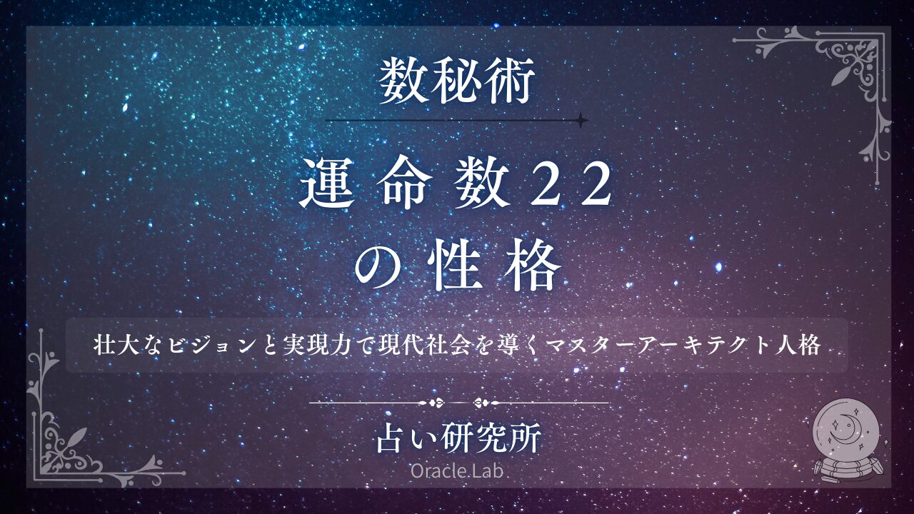 運命数22の性格について徹底解析。「ビジョンが大きすぎる性格で理解されない」「責任感が強すぎて疲弊する性格」「完璧主義で行動に移せない性格」「プレッシャーに弱くて潰れそうになる性格」「理想と現実を両立させようとする性格で葛藤する」「組織を動かす力が強すぎて孤立する性格」「期待が大きすぎて失敗を恐れる性格」といった運命数22特有の性格の悩みと改善策を詳しく紹介します。マスターナンバー22の性格分析から、恋愛・仕事・人間関係での性格活用法、現代社会で評価される性格の表現方法まで網羅的に解説。一般的な性格改善と専門的な数秘術性格鑑定の違いも比較し、運命数22が本来持つ「壮大なビジョン性格」「強力な実現力」「組織構築力」「実践的理想主義」「世界を変える性格」を最大限に発揮するための具体的アドバイスを提供。理想を現実化する性格を現代社会で最も価値の高いリーダーシップ人格に変える方法をお届けします。