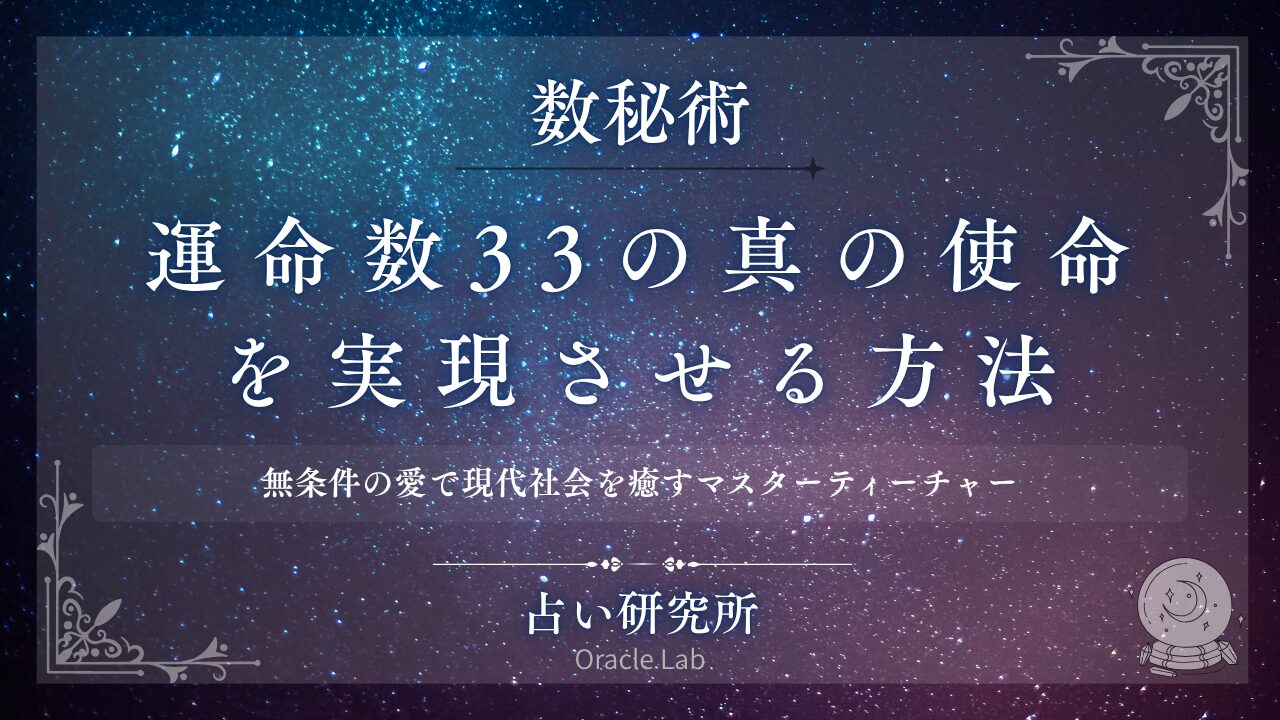 運命数33について徹底解析。「愛が深すぎて理解されない」「献身的すぎて疲弊する」「感受性が強すぎて傷つきやすい」「理想が高すぎて現実とのギャップに苦しむ」「自己犠牲が多すぎて自分を見失う」「スピリチュアルすぎて社会に馴染めない」「癒しの力が重荷になる」といった運命数33特有の悩みの原因と解決策を詳しく紹介します。マスターナンバー33の性格分析から、恋愛・仕事・人間関係での特徴、無条件の愛を現実化するキャリア選択まで網羅的に解説。一般的なスピリチュアル相談と専門的な数秘術鑑定の違いも比較し、運命数33が本来持つ「無条件の愛」「高い共感力」「癒しの力」「スピリチュアルな洞察」「献身的な奉仕」を最大限に発揮するための具体的アドバイスを提供。愛と癒しの才能を活かして、現代社会で真の癒し手となるための運命数33専用のロードマップをお届けします。