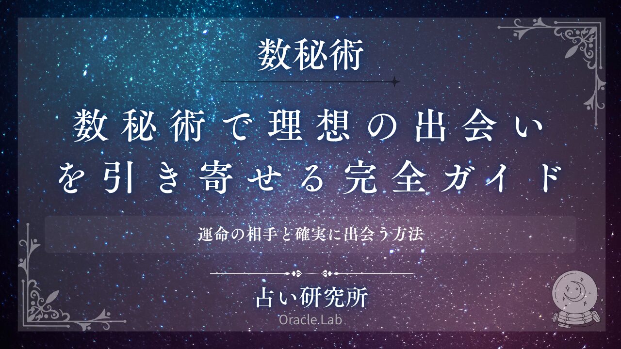 数秘術で理想の出会いを引き寄せる方法を徹底解説。「出会いがない」「理想の相手と出会いたい」「出会いのタイミングが知りたい」「どこで出会えるか知りたい」という悩みを、数秘術の視点から解決します。運命数から見る出会いやすい場所と時期、出会い運が高まる時期の予測、運命数別の理想の相手との出会い方、出会いの質を高める方法、出会いを逃さないサイン、数秘術を活用した出会い引き寄せ術まで網羅的に紹介。一般的な出会い探しと専門的な数秘術出会い鑑定の違いも比較し、あなたの運命数から最適な出会いの場所・時期・方法を明確にし、理想の相手と確実に出会うための実践的ロードマップをお届けします。