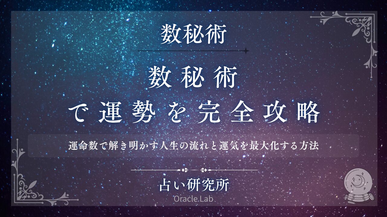 数秘術で運勢を徹底解析。「今年の運勢を知りたい」「運気を上げたい」「人生の流れを読みたい」「良い時期と悪い時期を知りたい」という悩みを、数秘術の視点から解決します。運命数1から9、マスターナンバー11・22・33それぞれの基本運勢、パーソナルイヤーで見る年運、パーソナルマンスで見る月運、運勢の波の読み方、運気を高める方法、運勢の転機を見極める方法、数秘術を活用した開運法まで網羅的に紹介。一般的な運勢占いと専門的な数秘術運勢鑑定の違いも比較し、あなたの運命数から運勢を正確に読み解き、人生の流れを味方につけ、確実に運気を最大化するための実践的ロードマップをお届けします。