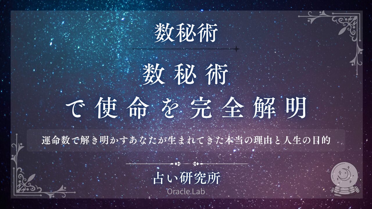 数秘術で使命を徹底解析。「自分の使命がわからない」「何のために生まれてきたのか知りたい」「人生の目的を見つけたい」「使命を果たして生きたい」という悩みを、数秘術の視点から解決します。運命数1から9、マスターナンバー11・22・33それぞれの使命、使命を見つける方法、使命を果たす具体的な道筋、使命と天職の違い、使命に気づくサイン、数秘術を活用した使命の実現法まで網羅的に紹介。一般的な自己啓発と専門的な数秘術使命鑑定の違いも比較し、あなたの運命数から使命を明確に特定し、人生の目的を果たし、魂が満たされる人生を送るための実践的ロードマップをお届けします。