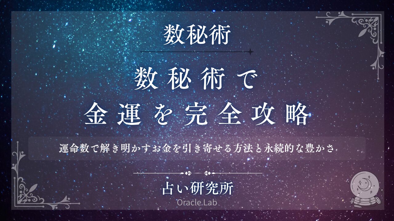 数秘術で金運を徹底解析。「お金が貯まらない」「金運を上げたい」「お金に恵まれる方法を知りたい」「経済的に豊かになりたい」という悩みを、数秘術の視点から解決します。運命数1から9、マスターナンバー11・22・33それぞれの金運の特徴、お金を引き寄せる方法、金運の高い時期の予測、運命数別のお金との付き合い方、金運を下げる注意点、数秘術を活用した富の構築法まで網羅的に紹介。一般的な金運アップ法と専門的な数秘術金運鑑定の違いも比較し、あなたの運命数から金運を最大化し、経済的な豊かさを確実に手に入れるための実践的ロードマップをお届けします。